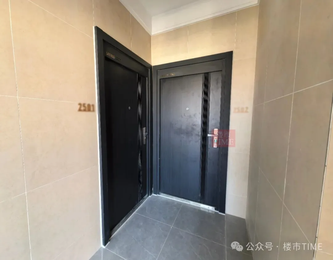 更让人哭笑不得的是户型设计硬伤:一梯两户的设计也就罢了,但两户人家大门紧挨成直角,近得可以共用一块门垫,就太过分了。