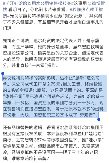 关键矛盾聚焦于浙江娃哈哈桶装水业务。2025 年 3 月,严学峰关联的迅尔城通(宏胜 100% 控股,宗馥莉任董事)接管浙江娃哈哈饮用水公司的桶装水销售权。