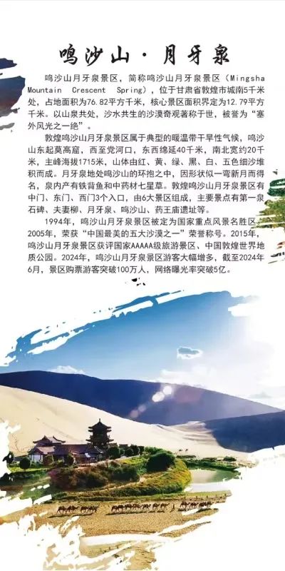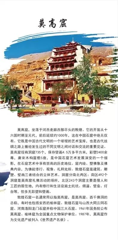 敦煌,一个在当今世界具有广泛影响力的中国历史文化名城。敦煌从历史中走来,它历经沧桑,几度盛衰,步履蹒跚地走过了近5000年漫长曲折的历程。悠久历史孕育的敦煌灿烂的古代文化,使敦煌展示出不同凡响的历史和文化色彩;那遍地的文物遗迹、浩繁的典籍文献、精美的石窟艺术、神秘的奇山异水,使这座古城流光溢彩,使戈壁绿洲越发郁郁葱葱、生机勃勃,就像一块青翠欲滴的翡翠镶嵌在金黄色的大漠上。敦煌,承载着中国数千年历史变迁的印记,记录着中华民族的盛衰荣辱。敦煌的文化值得珍藏、值得发掘、值得弘扬。今天,敦煌在党的坚强领导下,抢抓历史机遇,在改革开放的春风里从新启航出发,谱写出一曲曲自强不息、奋发有为的新歌,展示出不一样的新敦煌映像。敦煌已经成为中外游人的目的地,也是文人墨客为之高歌的文化圣地;更是历代书画家们为之倾慕的文化圣殿。