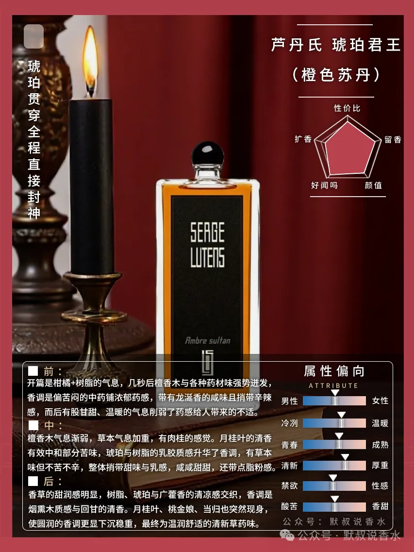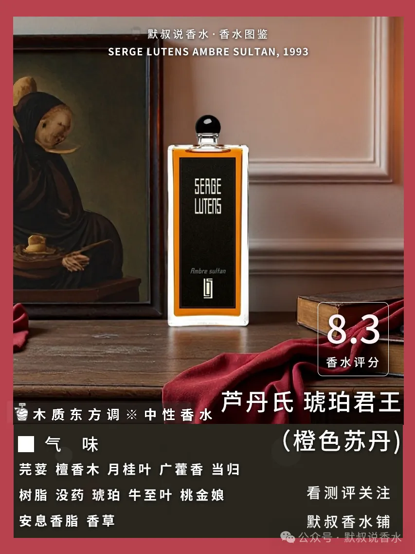 这款中性木质东方调香水,琥珀贯穿全程,层次从苦闷药感转为咸甜乳感再落清新草药味,个性鲜明,不同批次质感有差异,琥珀爱好者认可度高。