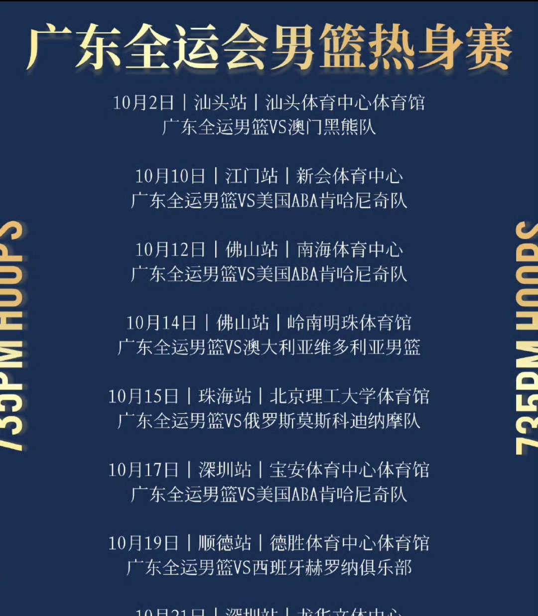 先来看广东男篮的热身赛,他们是所有球队中赛程最密集的,而且广东队在过去的九月份,也有多场热身赛。目前10月份未开始的热身赛有七场,分别是10日江门站,14日佛山站,15日珠海站,17日深圳站,19日顺德站,21日深圳站。目前赵睿、崔永熙已经回归球队,接下来就看热身赛能不能上场了,赵睿应该问题不大,崔永熙暂时无法确定。
