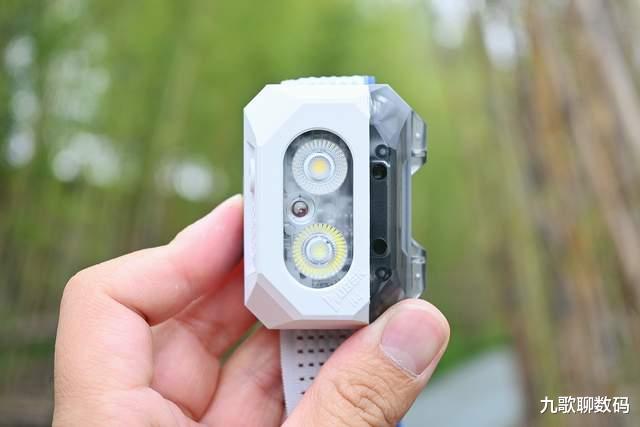 重点看下H4本体吧,外观设计很有自家特色,由顶额两点的“眉毛”为红外手势感应模块,下方两颗LED灯珠组成的一双大眼睛,搭配底部的红光副灯和特意切削的两侧切面,使其一眼看去便像是尖嘴猴腮的小猴子,富有灵气,也透着股可爱劲儿。灯身尺寸小巧,工塑材质的机身使其整重仅为80克,即便加上灯带也可以做到久戴而轻若无物,非常适合户外活动时的长时间佩戴。