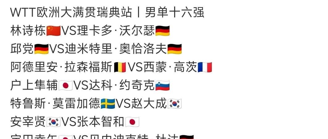 北京时间8月21日,乒乓球WTT瑞典大满贯赛,随着莫雷加德惊艰难战胜松岛辉空晋级,至此男单16强名单全部诞生,国乒大败,只有林诗栋一人晋级,其余林高远,向鹏,梁靖崑,陈垣宇,温瑞博5位选手都输外战出局,国乒夺冠压力来到林诗栋身上,在今天凌晨结束的比赛中,小将陈垣宇1-3不敌韩国小将吴晙诚,温瑞博1-3惜败世界冠军雨果.卡尔德拉诺,未能成功阻击,而杜达3-2险胜普卡,莫雷加德3-2险胜松岛辉空,具体赛况如下: