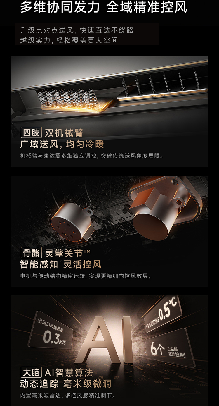 追觅双机械臂空调以用户需求为创新导向,通过创新的“双机械臂驭风技术”实现了从固定风到动态风的技术跨越。其双机械臂设计与康达翼协同,实现了126°超广角送风和8米远距离覆盖,彻底突破了传统空调的送风局限。同时通过内置毫米波雷达和AI人感算法,使空调能够实时监测室内家庭成员的位置,智能调整送风方向。再结合灵擎关节™等精密传动结构带来的多级风感调节能力,满足全场景的个性化需求,开启全新的智能送风时代。