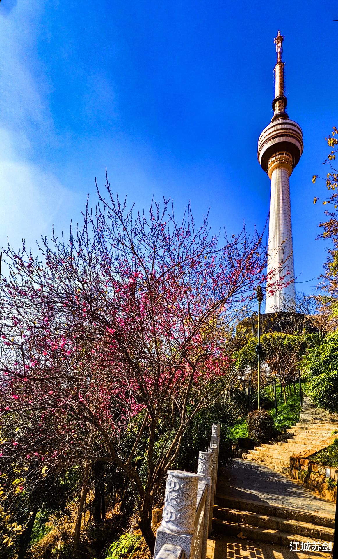 立春将至,龟山先声夺人。石阶两侧,老梅燃成暗红火瀑,为“亚洲桅杆”系上跳动的红绸。登拂云亭回望,电视塔的冷峻钢筋与柔软花瓣同框,一刚一柔,点亮江城冬日。江风携香俯冲,与江雾勾兑,替崔颢的“晴川芳草”重新上色。游人齐举手机,把塔尖、桥影、红梅一并收入镜头,让“龟蛇锁大江”的古老意象住进数字相册。梅期短,却提醒钢筋水泥之上,四季仍在轮转,城市仍有花香。
