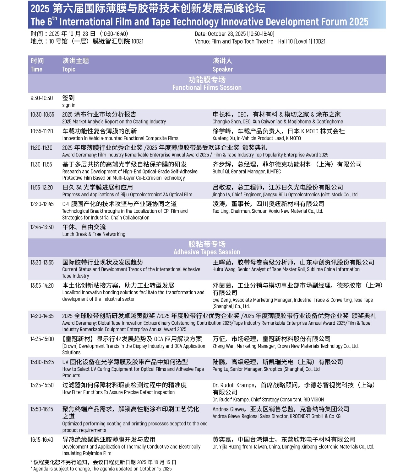 2025第六届国际薄膜与胶带技术创新发展高峰论坛:聚焦全球薄膜与胶带产业的前沿技术创新,解读国内外产业政策导向,分析市场需求变化趋势,探讨技术创新与产业升级路径,助力企业把握行业发展机遇。
