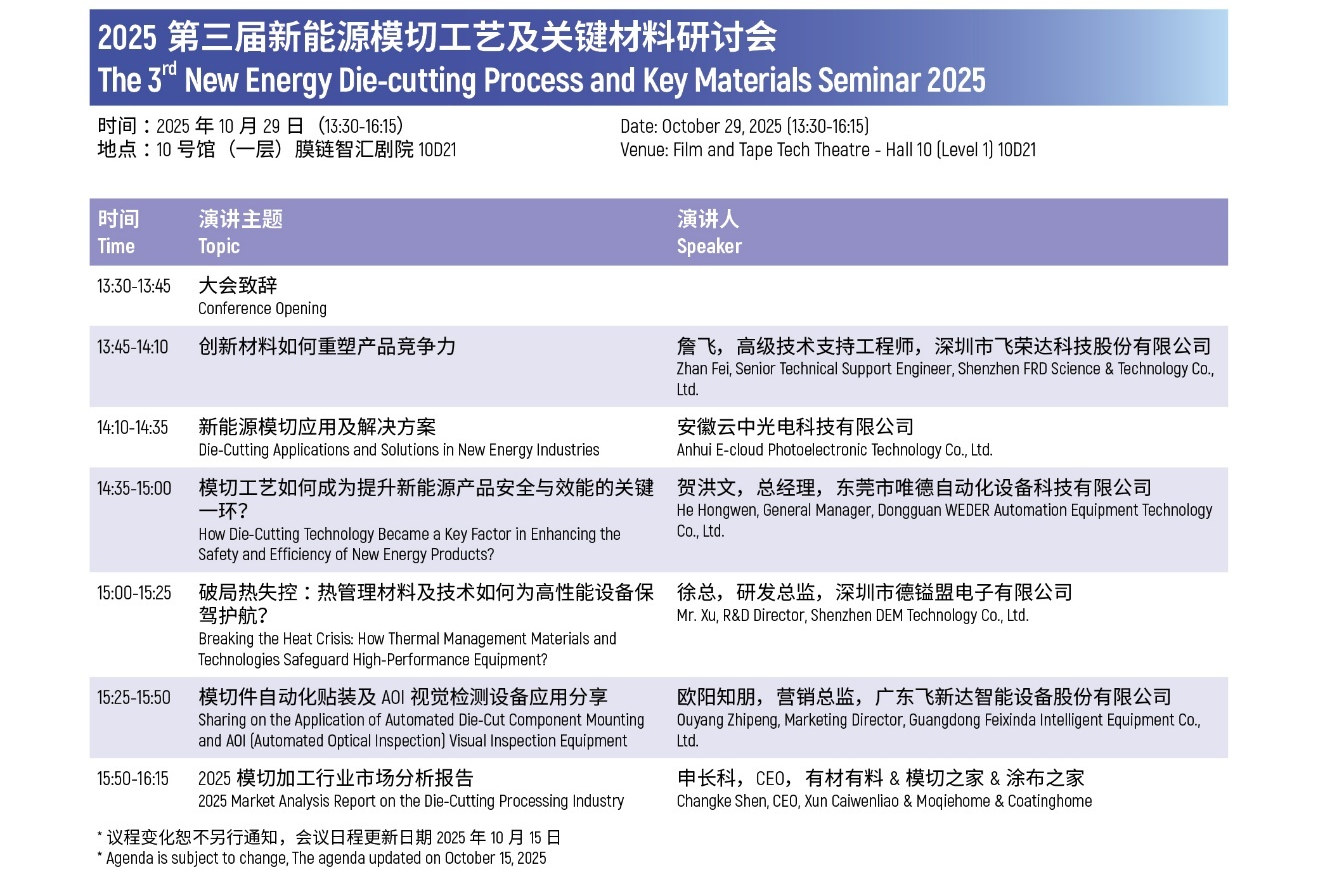 2025第三届新能源模切工艺及关键材料研讨会:聚焦新能源等领域的模切工艺技术创新与关键材料应用,分享模切工艺优化方案与材料选型经验,提升新能源模切产品的质量与性能。