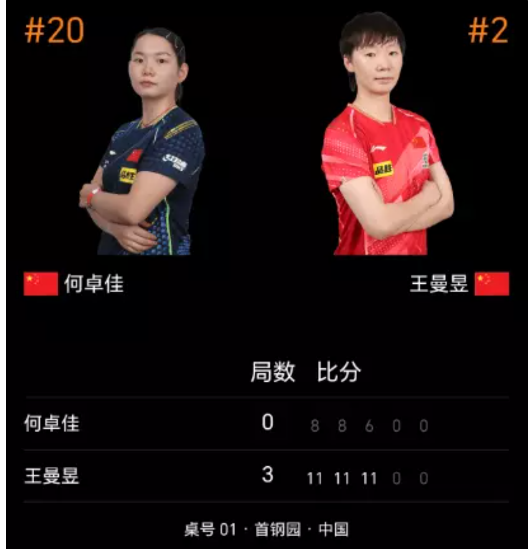 第三局背水一战的何卓佳改变战术,从王曼昱正手位突破,但收效甚微。王曼昱在3-4落后时连得5分确立优势,最终以11-6锁定胜局,总比分3-0横扫对手晋级32强。