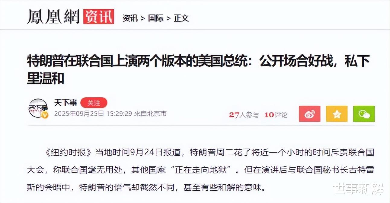 9月23日召开的联合国大会,简直成了特朗普的专场。规定的15分钟演讲,他强行讲了一个多小时,其实主要就讲了三件事,不过,他的公开场合和私下里的表现用美媒话来说,就是两面派,难怪他对俄乌冲突改变了看法,欧洲也不敢信他。