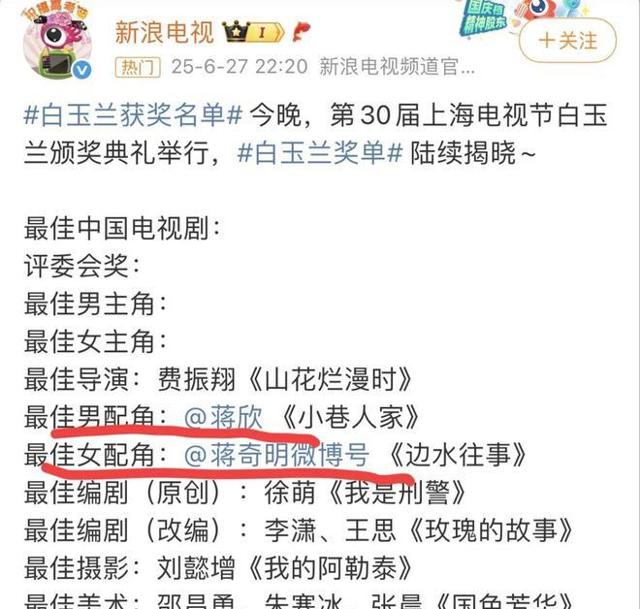 获奖名单中,最佳男女配角分别是蒋奇明和蒋欣,新浪电视居然将两人的名字打反了。