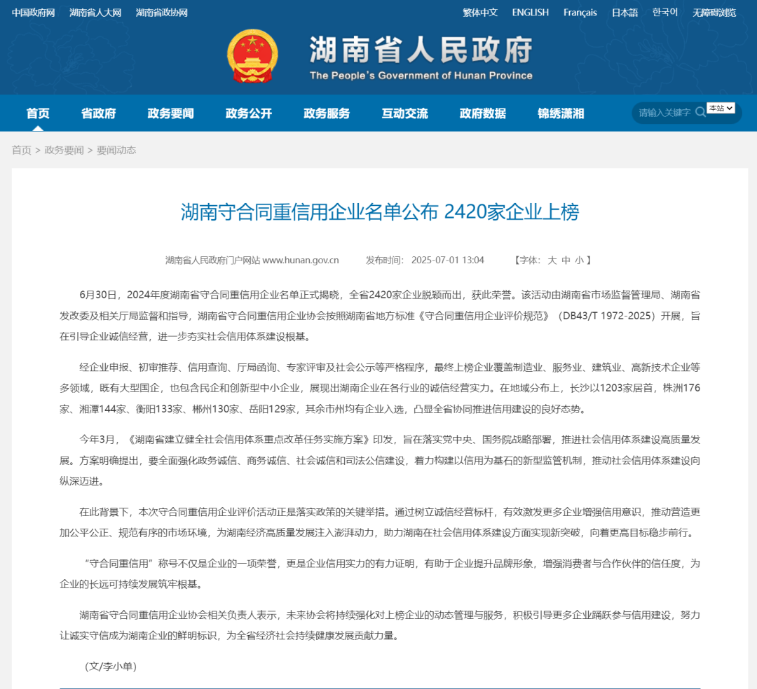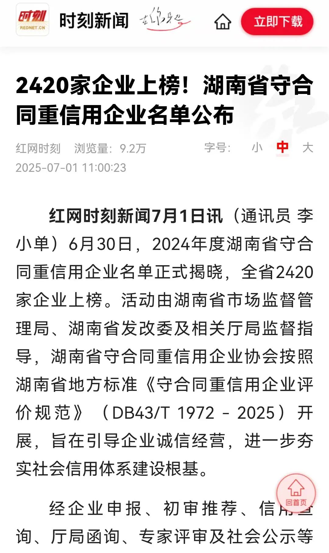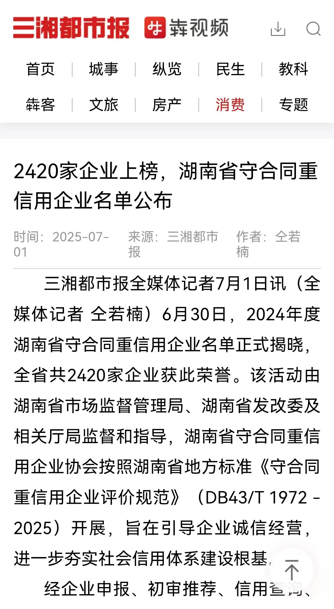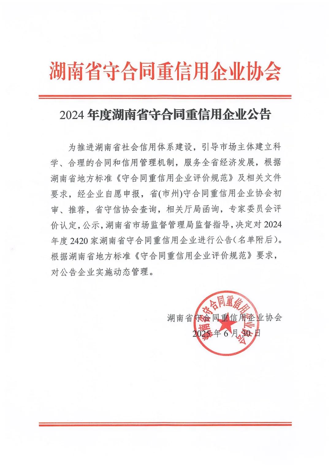 为推进社会信用体系建设,引导市场主体健全合同信用管理机制,服务省市经济发展,湖南省及长沙市守合同重信用企业协会每年开展“守合同重信用”企业公示活动,表彰企业在合同管理、履约能力及社会信誉等方面的突出表现。依据《湖南省守合同重信用企业评价规范》等要求,经企业申报、协会初审推荐、信用核查、部门函询、专家评审及公示等严格程序,最终评选出获誉企业。