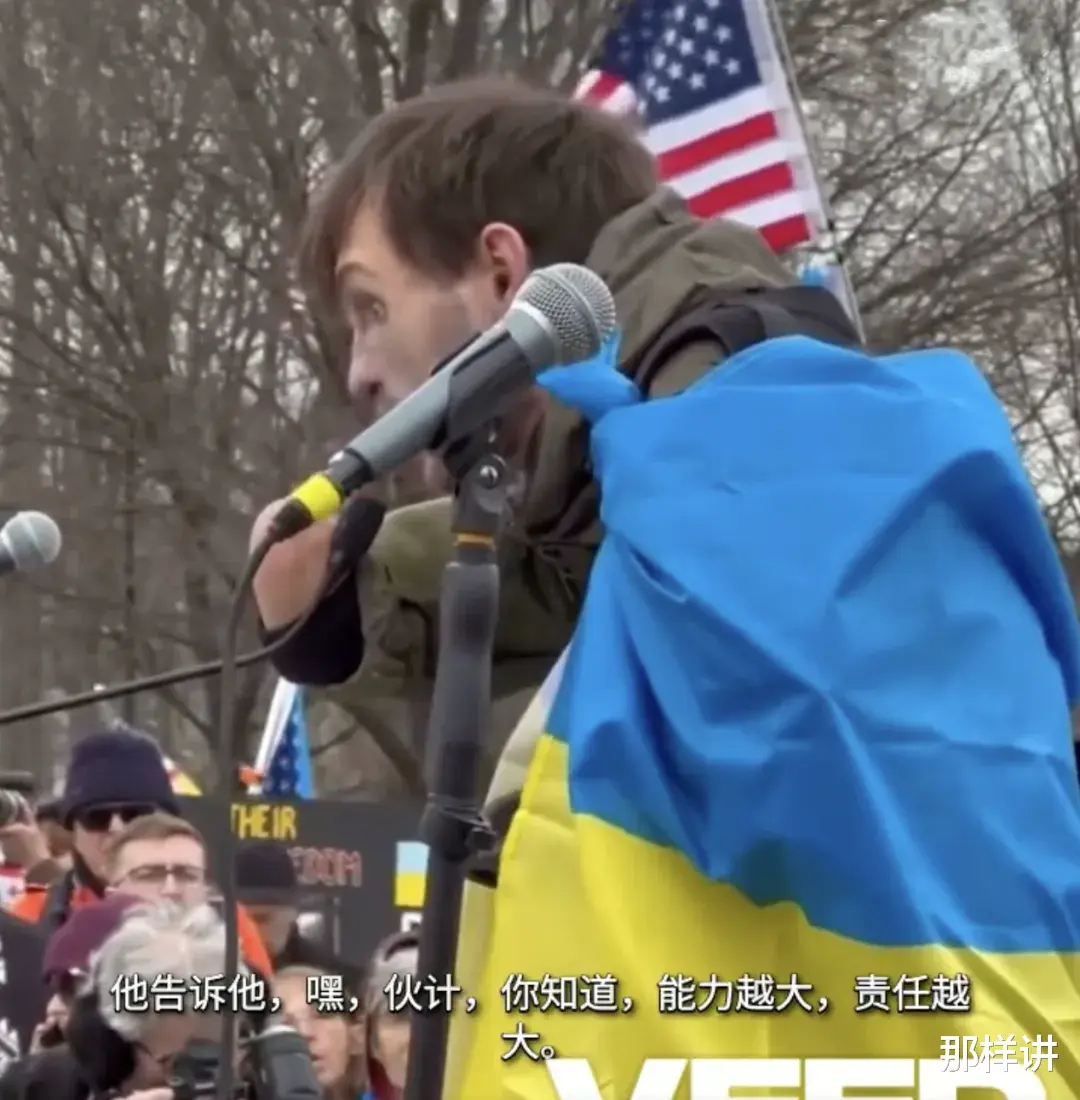 我很喜欢美国电影《蜊蛛侠》。如果有人记得比尔叔叔告诉侄子蜘蛛侠的话,他告诉他,嘿,伙计,你知道能力越大,责任越大。这就是我现在对所有美国人、美国政府的呼吁,勇敢地参与战斗,停止在海洋彼端与乌克兰保持距离,加入战斗,成为民主世界的坚强守护者,一起并肩战斗……荣耀属于乌克兰!