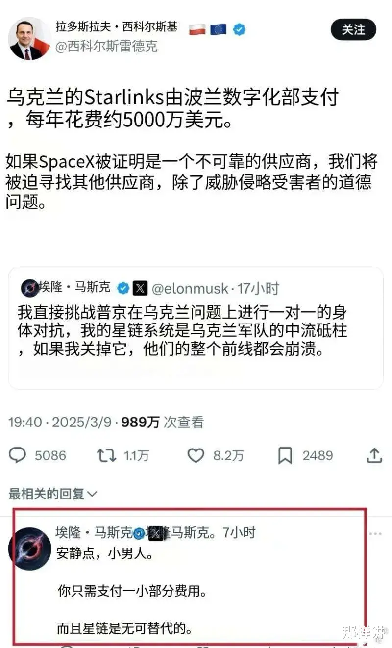 万斯是一个十足的混蛋,作为特朗普头号功狗的马斯克,也不遑多让。波兰外长警告马斯克,不能断绝乌克兰的星链,因为波兰付钱了。但是马斯克呢,不但无视契约精神,还讽刺波兰外长是“小男人”(另有翻译为“小矮人”)。