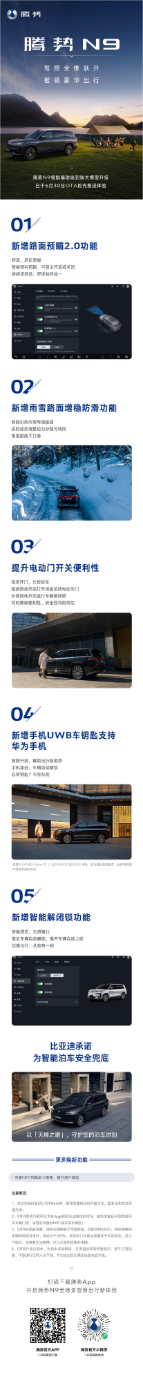 本次升级新增路面预瞄2.0,提前感知路面状况,轻松应对颠簸路段;雨雪路面增稳防滑,实时监测车轮抓地力,出行安全更有保障;电动门开关更便利,短按长按就能轻松开关车门。此外,手机UWB车钥匙新增对华为手机的支持,还带来智能解闭锁功能,靠近自动解锁,离开自动上锁,超贴心~