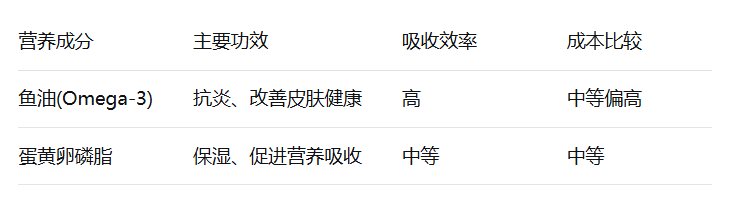 从毛发健康角度,鱼油在改善皮肤炎症和毛质方面表现更突出,而蛋黄卵磷脂在改善皮肤干燥和促进营养吸收方面更为出色。