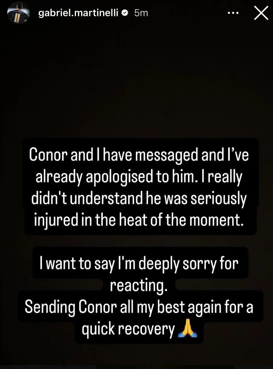 马丁内利赛后在IG上向布拉德利表达了歉意。