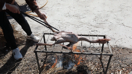 接着烧起了稻草堆,将鹅架在火上烧去残存的毛根,