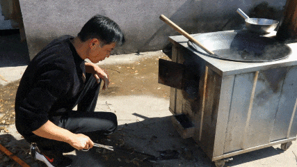 铁锅烧热加入金黄透亮的茶油,鹅肉随之下锅,并不断翻炒,保证每一块肉都均匀受热,茶油独特的香气丝丝缕缕地渗进鹅肉内部。待鹅肉表面微焦,便一边翻炒一边撒入米粉,持续的煸炒下,汤汁逐渐浓稠。