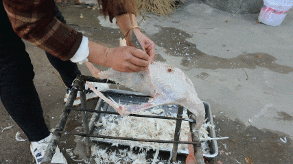 看似简单却是个细致活,老板夫妻二人围着鹅团团转,