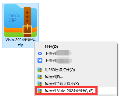 1、得到压缩包之后,鼠标右键解压,点击【解压到Visio 2024安装包】。
