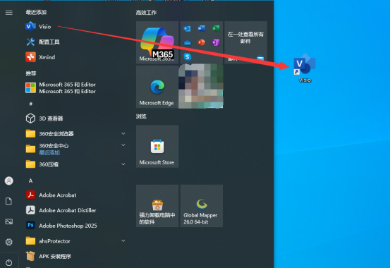 10、去桌面左下角开始按钮里面找到刚安装的【Visio】软件,鼠标左键按住不放,拖拽到电脑桌面。