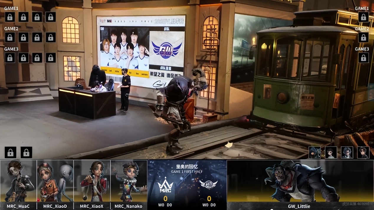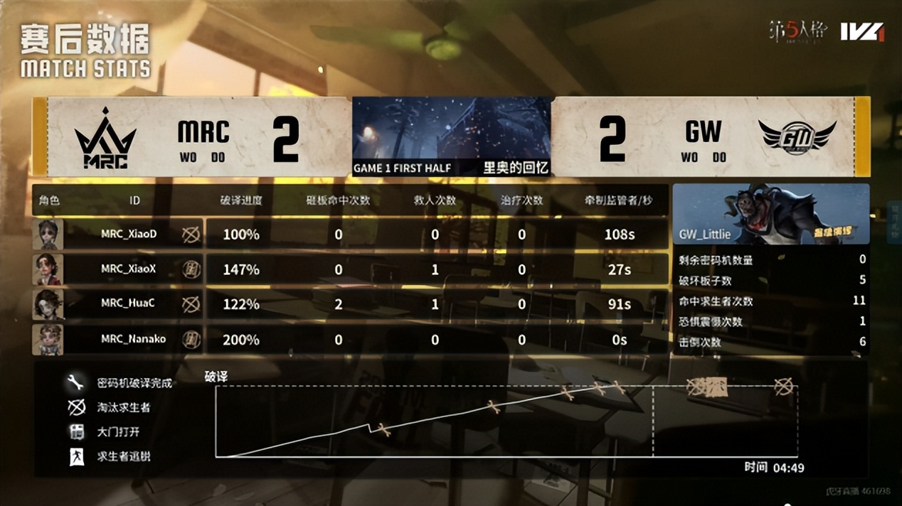 MRC的求生者选择了木偶师、机械师、大副、杂技演员;GW的监管者Littlie选择了“跛脚羊”。(BAN先知、古董商、“骑士”、幸运儿)