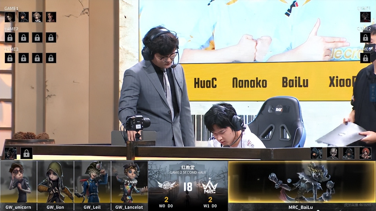 GW的求生者选择了幸运儿、佣兵、火灾调查员、杂技演员(BAN“跛脚羊”);MRC的监管者BaiLu选择了“喧嚣”。(BAN先知、“逃脱大师”、飞行家、弓箭手)