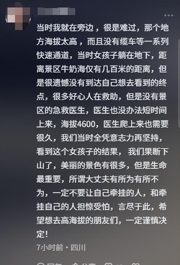 有游客提到曾在前往牛奶海的路上见到担架队,担架上的女性“面色发青,情况看起来很糟”。