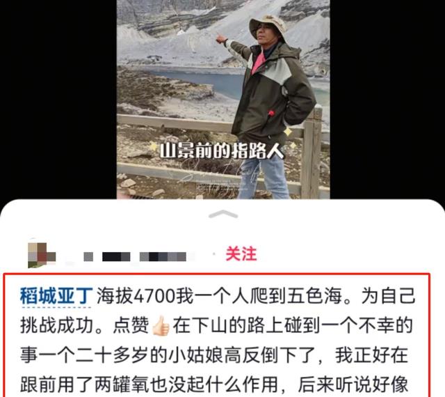 一位独自登顶的户外博主在下山途中发现异常,将自己携带的两罐氧气全部递给患者。