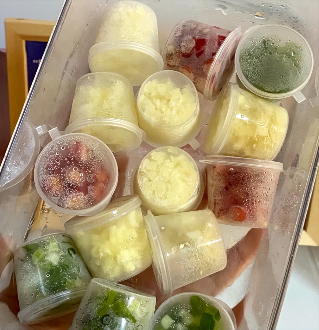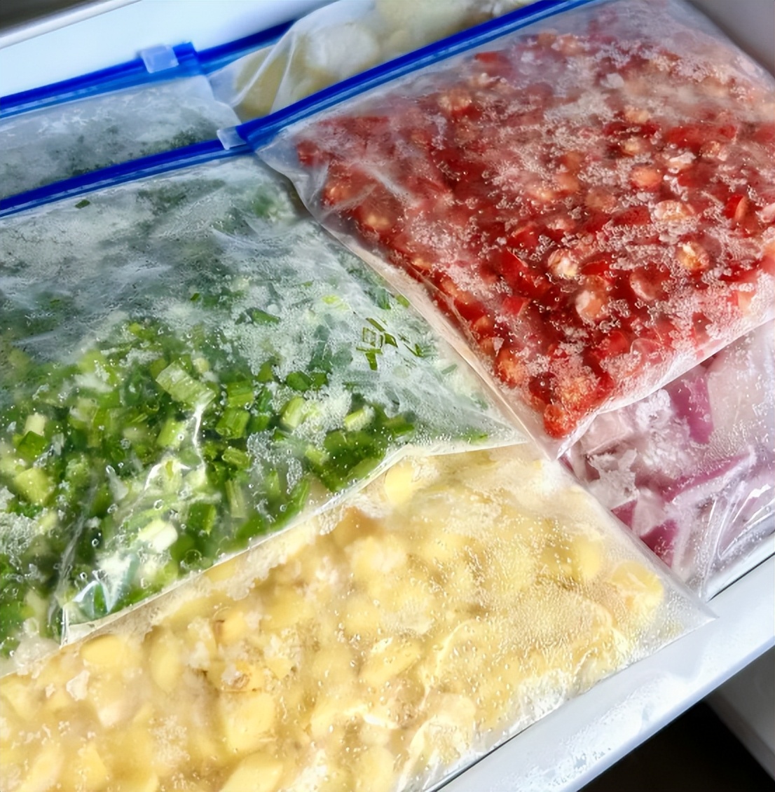每次买回来的葱姜蒜、小米辣,每次做饭都能用到这些食材,一次性可以切多一些,然后冷冻起来。