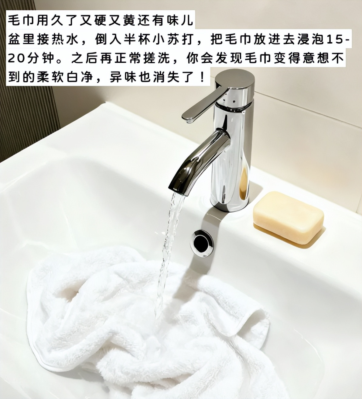 想要清洁干净的话,在热水里面倒入适量的小苏打,把毛巾、抹布放进去泡15分钟左右,在正常搓洗一下,毛巾瞬间干净多了。