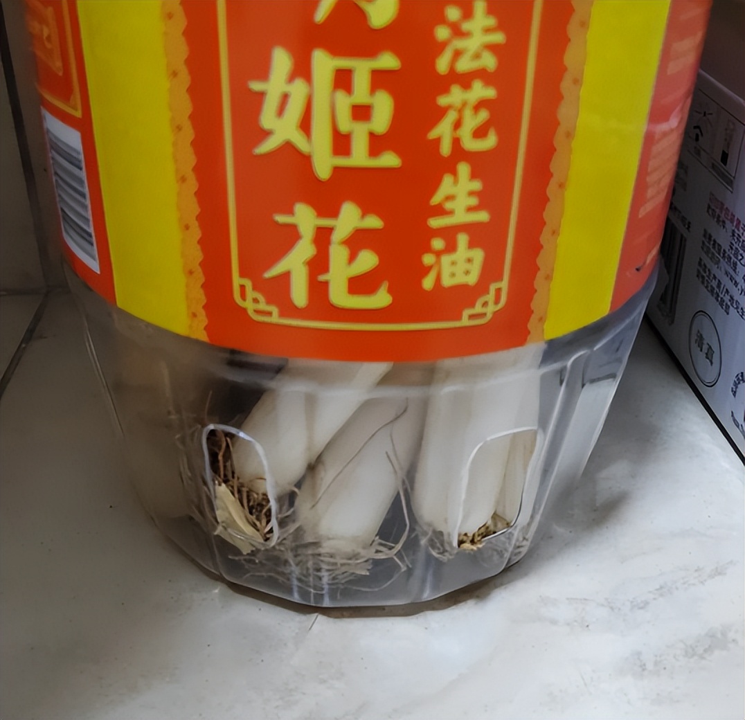 把油桶剪裁一下,只留下下半部分,用来装山药、大葱刚刚好。