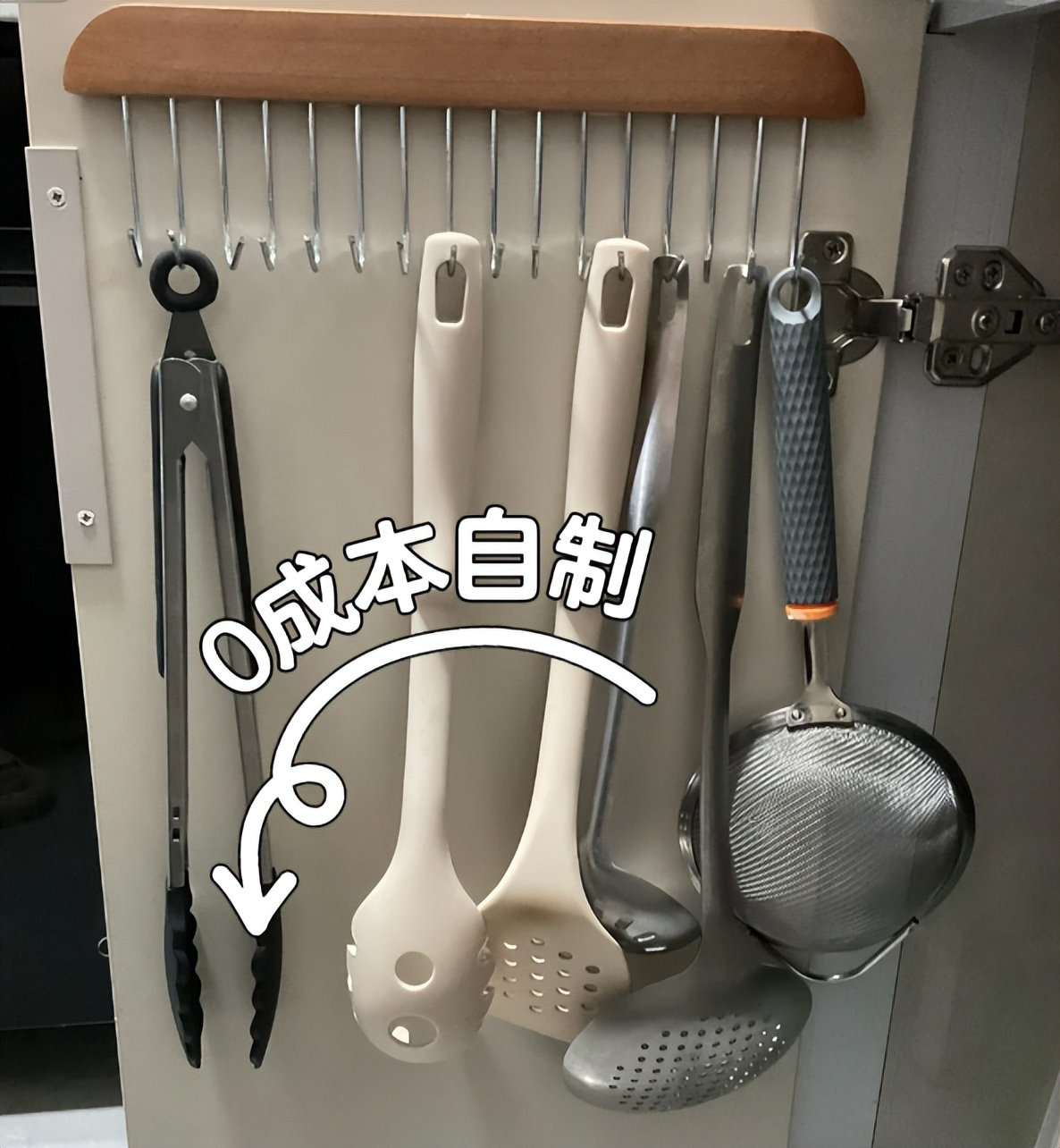 剩下的部分固定在柜门后面,平时可以把厨房工具挂在上面,收纳效果特别好。