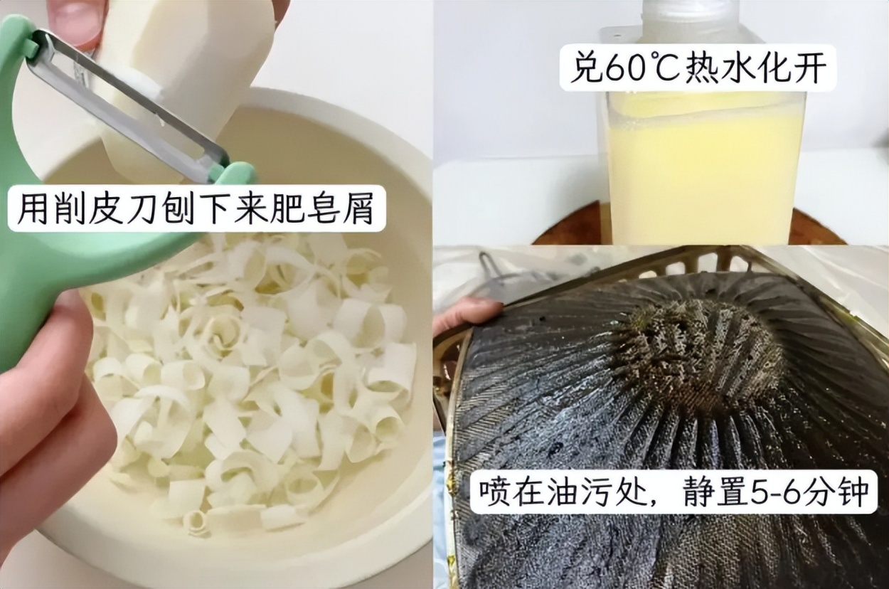 油烟机上面厚重的污垢,把肥皂刮下肥皂屑,用60°c热水化开,喷在油污处,静置5~6分钟左右,顽固油污就慢慢溶解了。