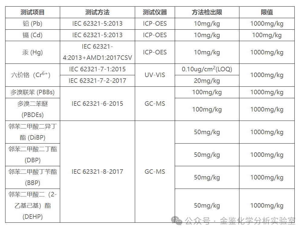 测试项目包括铅、镉、汞、六价铬、多溴联苯、多溴二苯醚以及四种邻苯二甲酸酯,采用的测试方法和仪器包括: