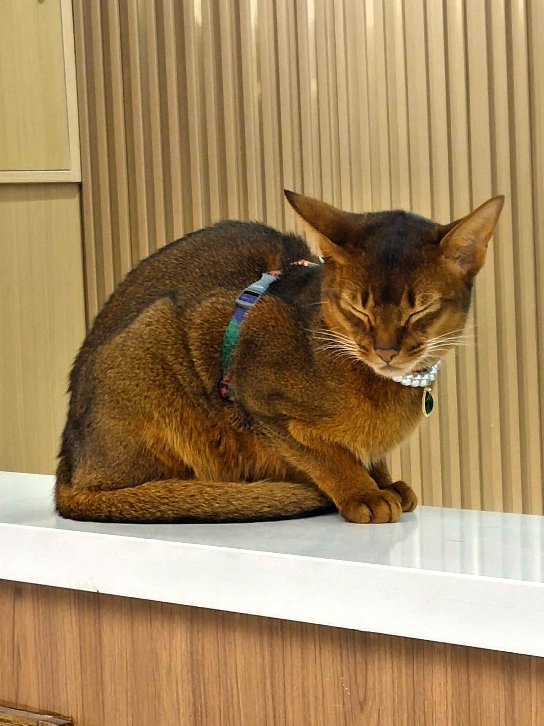往前走看到一只猫端坐在吧台上,姿态优雅,那是一只脖子上带着一颗祖母绿项链的猫,毛发像貂一样丝滑,睁开眼有一种贵妇般的傲娇,路人忍不住停下观赏。