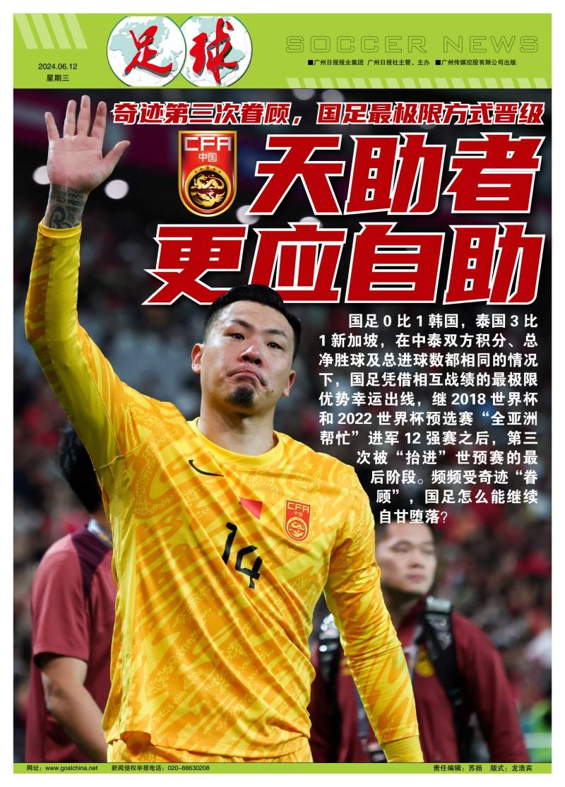 尽管国足拼尽全力依旧难挽对韩国的一球小负,但同组更晚进行的另一场对决中,泰国仅以3比1击败新加坡,在中泰双方积分、总净胜球及总进球数都相同的情况下,国足凭借相互战绩的最极限优势幸运出线,继2018世界杯和2022世界杯预选赛“全亚洲帮忙”进军12强赛之后,第三次被“抬进”世预赛的最后阶段。频频受奇迹“眷顾”,国足如何有脸继续自甘堕落?
