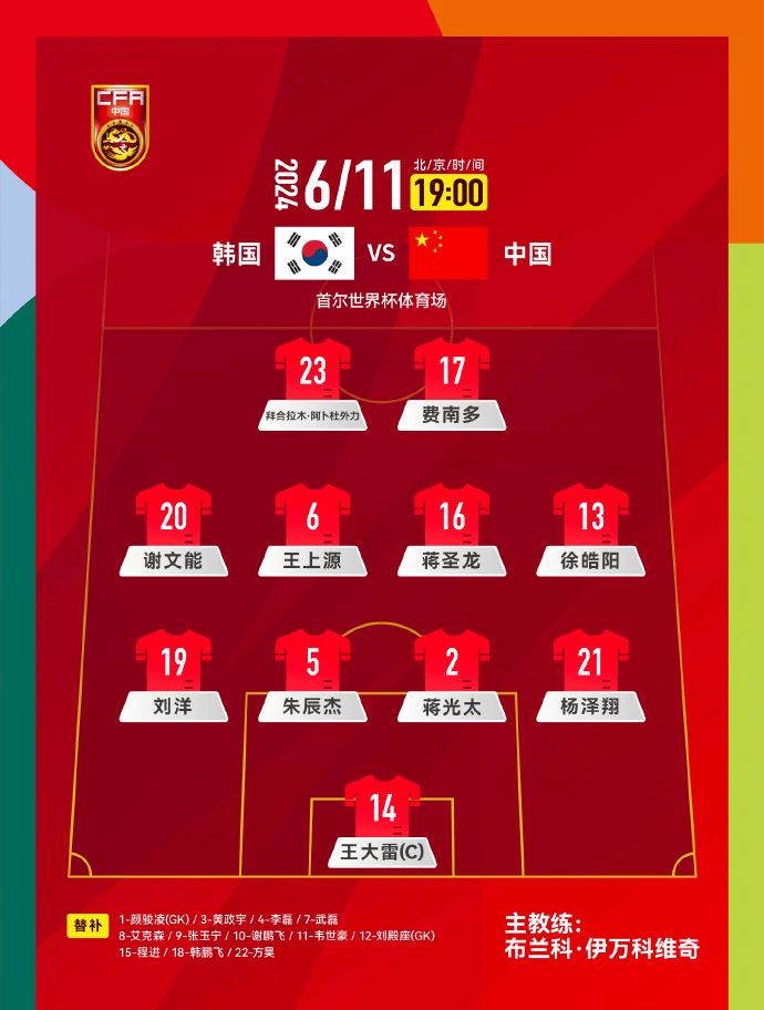 本场比赛,伊万科维奇对阵容和阵型进行了大幅度的调整,张玉宁、武磊、韦世豪都没有首发出战,伊万科维奇最终排出了442双后腰的阵型,门将依旧是王大雷,带伤出战;四后卫是刘洋、朱辰杰、蒋光太和杨泽翔,王振澳因伤未进入23人名单;双后腰是王上源和蒋圣龙,两个边路则是徐皓阳和谢文能;前锋是拜合拉木和费南多。