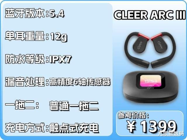 CLEER ARC III采用蓝牙5.4芯片,结合双麦通话降噪技术,即便在嘈杂环境中也能实现清晰交流。其16.2mm动圈扬声器与高精度6轴传感器相辅相成,不仅有效减少声音延迟,更能精准还原音乐细节,呈现沉浸式聆听体验,高低频表现均衡且自然。在佩戴设计上,单耳仅重12g,搭配弹性仿生耳挂和0度硅胶材质,能够自适应贴合耳廓曲线,长时间佩戴无压迫感,同时避免闷堵耳道,无论是运动还是日常使用都非常舒适。其防水等级达到IPX7,可抵御雨水或汗水侵蚀。续航方面,单耳支持10小时使用,配合充电仓总续航可达40小时,满足全天候使用需求的。