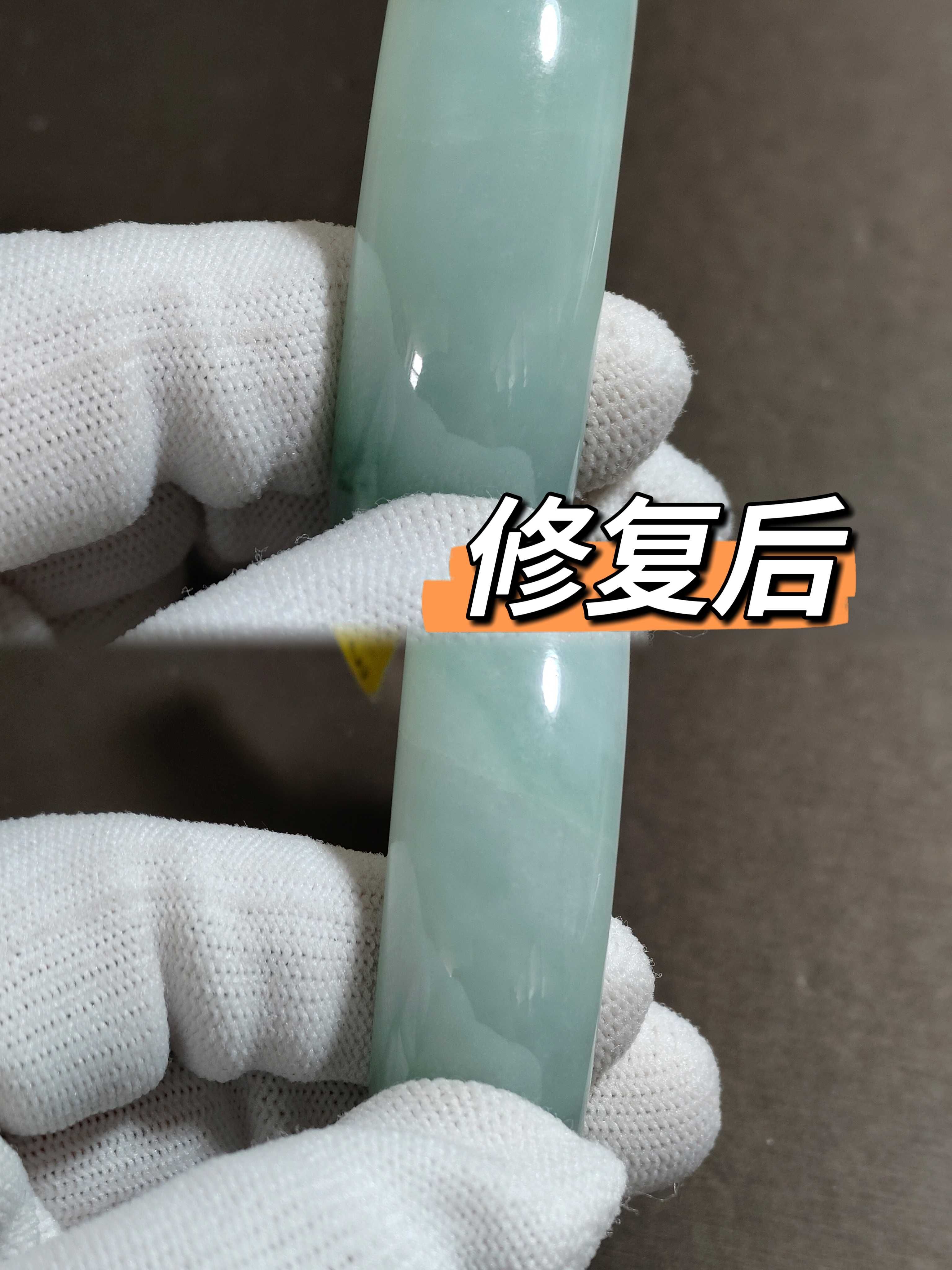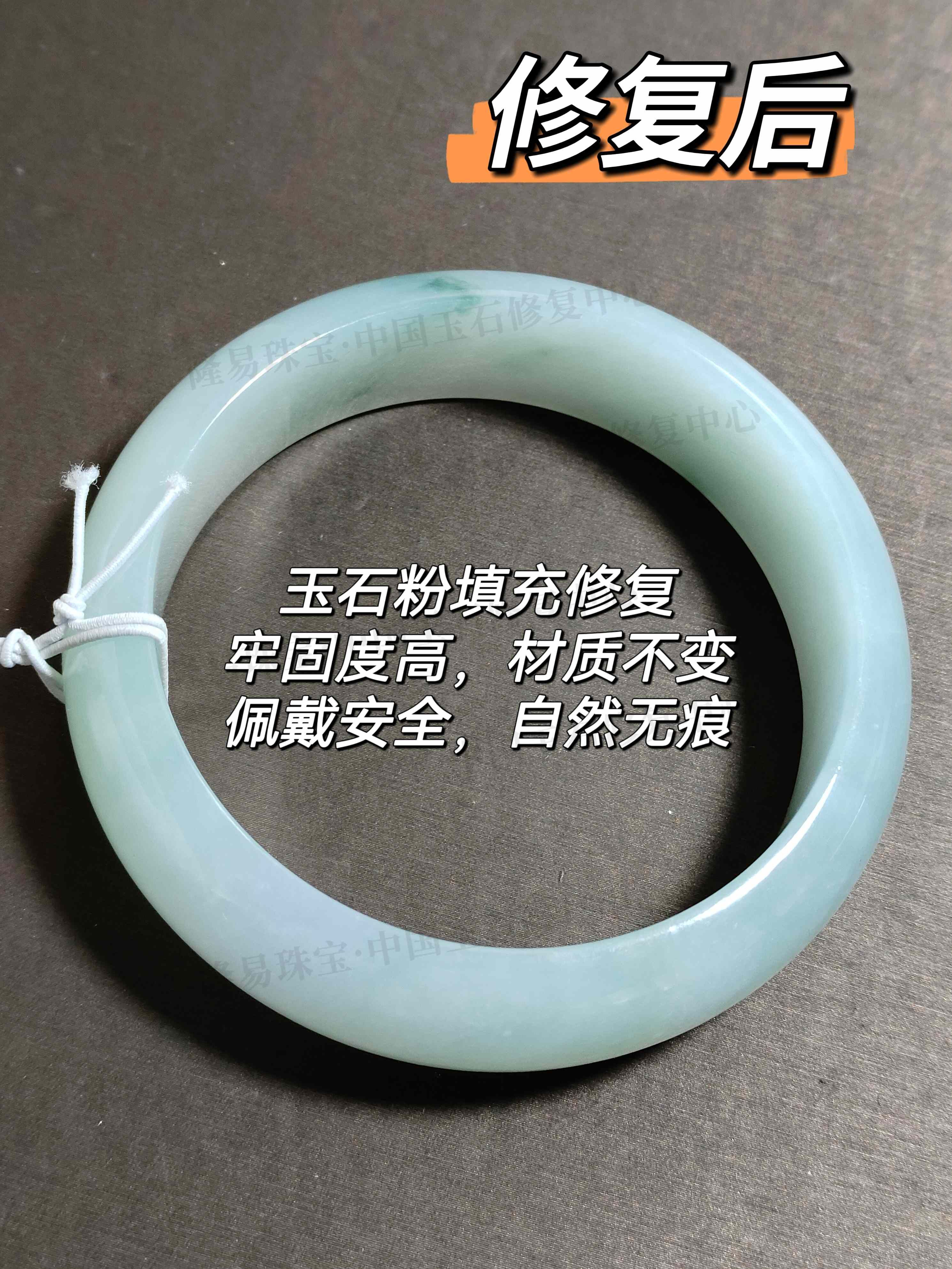 玉石粉填充修复,天然玉石粉,不仅与玉镯颜色材质契合度高,材料也安全无害。 修复后不会改变玉镯材质,牢固度高,可正常佩戴不会断。 不同于包金包银,无痕修复后镯面干净整洁更自然美观哦。