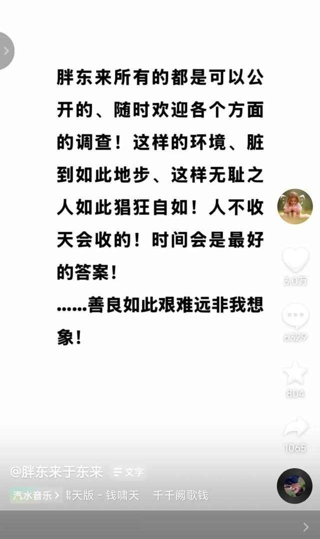 结果在于东来控诉不久,抖音平台连夜加班,下架了29条视频,罚了造谣者一个月不准发视频(相当于让话痨闭嘴30天)。