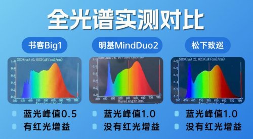 (2)三款灯实测结果对比• 书客Big1:蓝光峰值0.5,具备明显红光增益 • 明基MindDuo2:蓝光峰值1.0,无红光增益 • 松下致巡:蓝光峰值1.0,无红光增益