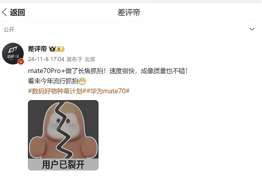 另外就是华为Mate70Pro+的长焦抓拍效果,这可是华为手机拍摄的特色功能。之前华为Pura70Ultra的抓拍功能就备受称赞,华为Mate70Pro+很可能也是基于微距长焦的技术,对于拍摄速度和成像效果方面进行升级,更适合喜欢拍照的用户。