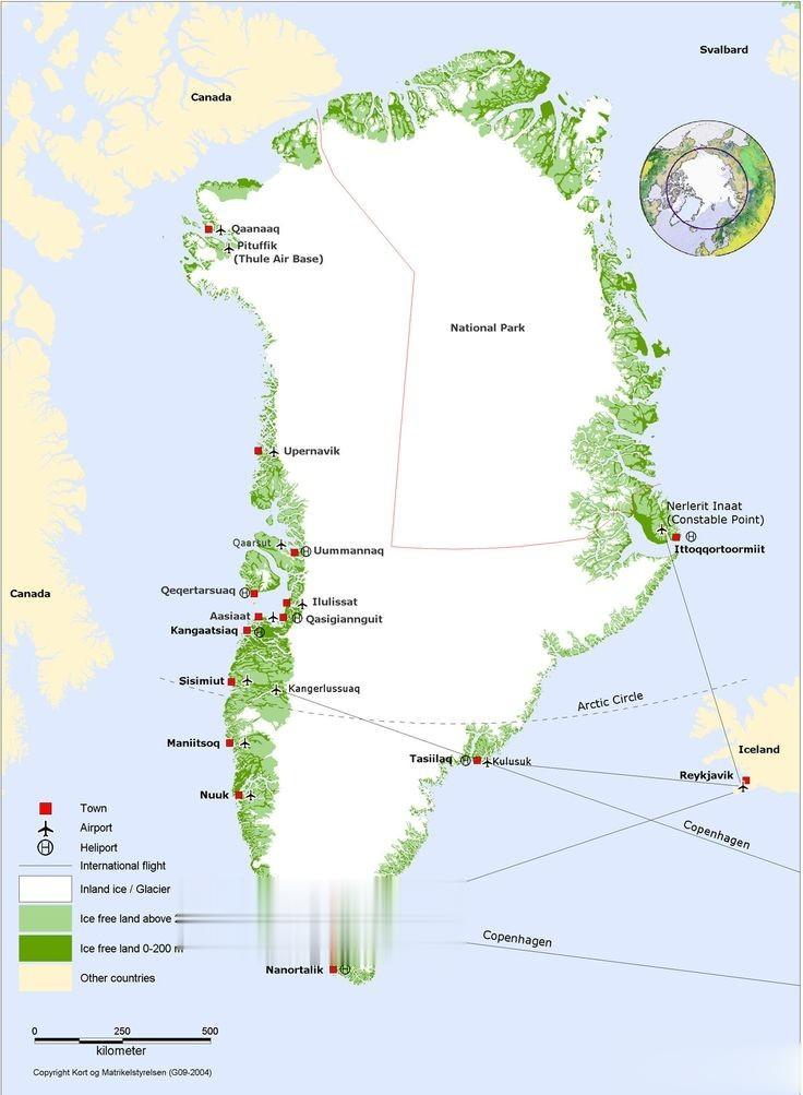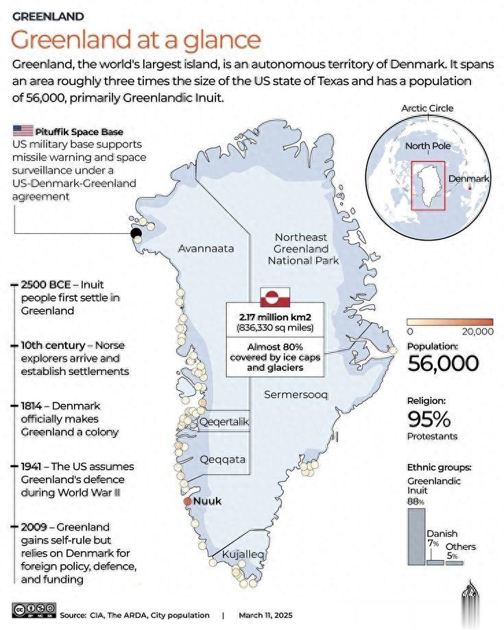 格陵兰是世界上最大的岛屿,是丹麦的自治领土。它的面积2.1700万平方公里(836,330平方英里),大约是美国德克萨斯州的三倍,几乎80%被冰盖和冰川覆盖。人口为56,000人,主要是格陵兰因纽特人。