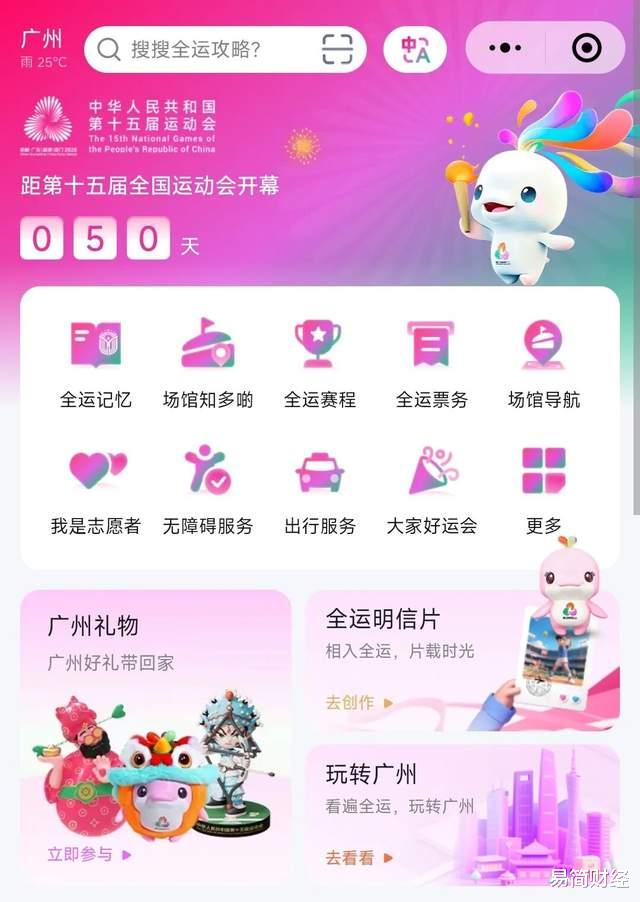 易简财经惊喜地发现,在全运广州小程序上,广州全运攻略已经上线——包括具体的赛程安排、购票入口、详尽的场馆地图等。