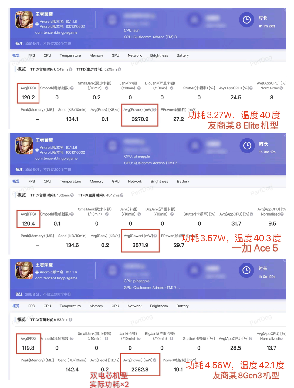 往年12月数码圈都是很热闹的,今天李杰就正式官宣了#一加Ace5 系列 。果然骁龙上限看一加,微博还放出了120帧+极致画质连续玩一小时王者的测试,功率低的可怕,功耗仅为3.57W,最高温40.3度。与骁龙8Elite机型相比,一加Ace 5在相似功耗下提供了更优的帧率表现。并且一加这次有个游戏“开挂”新技术,内部代号“毒液”,力求把骁龙8 Gen3的最优性能释放出来。
