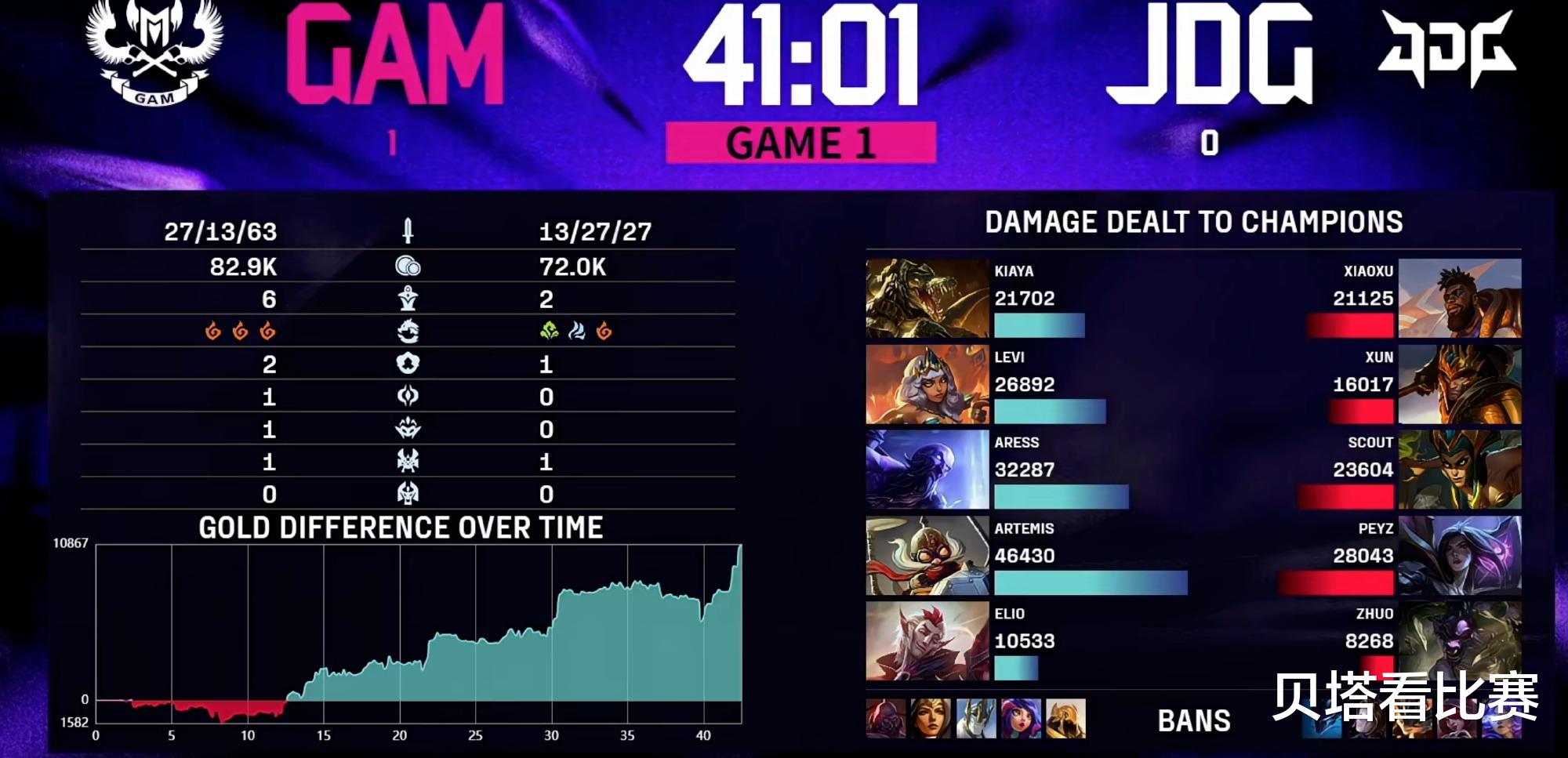 中期双方河道混战,JDG中野大招失误,后面追击琪亚娜上头,GAM反打打出2换4后,拿下厄塔汗。28分钟JDG主动打大龙,GAM赶来阻止,scout蛇女拦住GAM瑞兹,反被瑞兹单杀,正面4V4,GAM上单鳄鱼无敌,Peyz卡莎被琪亚娜秒杀,GAM打出1换4后,拿下第一条大龙。38分钟JDG偷下第二条大龙,GAM赶来后开团,先击杀zhuo牛头后,包夹打出2换4。40分钟双方争夺小龙,虽然xun皇子抢下小龙,但是peyz卡莎R到后排被打成残血,GAM团灭JDG后,拿下第一局的胜利。首局伤害最高的是GAM飞机。