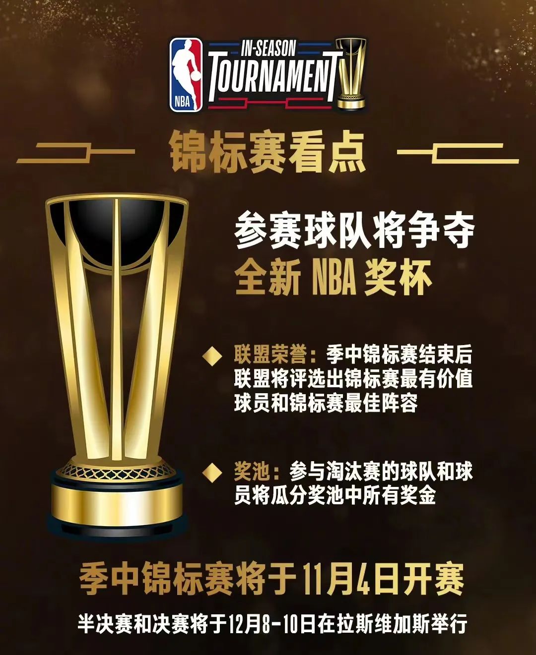 这不,NBA弄了一个新的赛制:季中锦标赛。常规赛一般是在十月中下旬开始比赛,而季中赛已经定了开赛日:11月4日,赛会目标也很简单粗暴:夺冠,分钱。