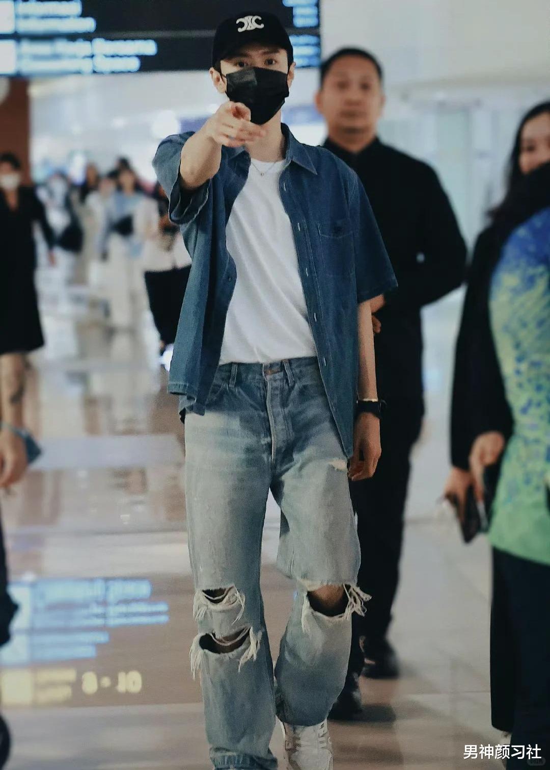 刘宇宁的这条破洞牛仔裤也特别有意思,其实它的洞口是不对称的,用来搭配黑色短袖就显得他整个人非常的有破碎感。比起基础款的牛仔裤来说,它要更显个性一些。而且他在皮带上下了点功夫,用的是有设计感的皮带,整个人的风格瞬间就变得耳目一新。