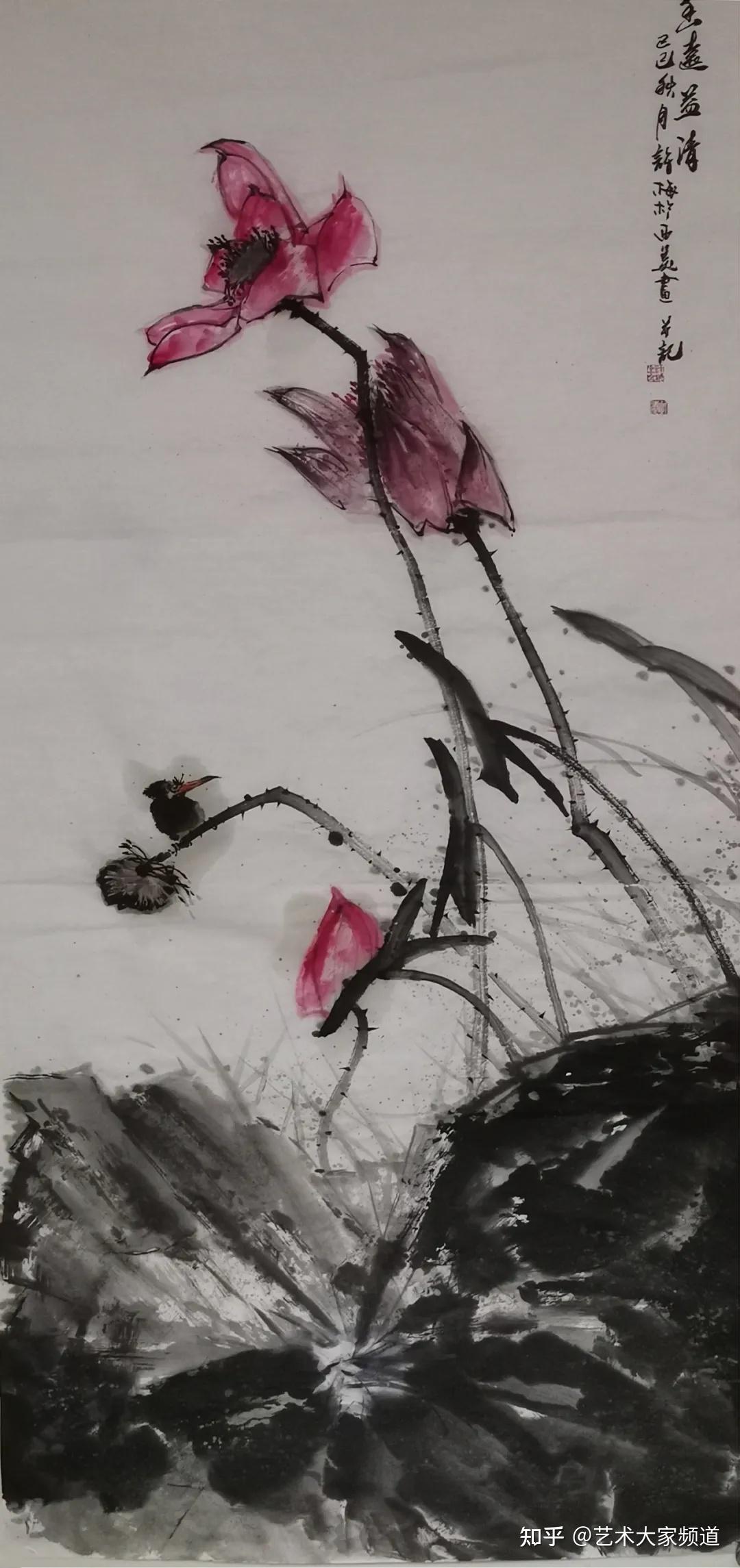 许梅的艺术之路,始于幼年的痴迷,继而升华于系统的专业研习。其画作清晰地显示出对传统中国画语言的深入理解和娴熟运用。在荷花题材的作品中,可见其对水墨特性的精妙掌控。大片的荷叶以大笔泼墨写出,水与墨的交融、冲撞、渗化,形成浓淡相宜、层次丰富的墨色变化,既厚重饱满,又通透空灵,完美再现了“接天莲叶”的生意与韵味。而细劲挺拔的荷梗,则多用中锋勾勒,线条圆润而富有韧性,支撑起整个画面的骨架。在梅花、牡丹等作品中,其用笔或苍劲虬曲,或圆润饱满,皆能依据物象的物理与画家的心意而变化,展现出扎实的书法用笔功底。